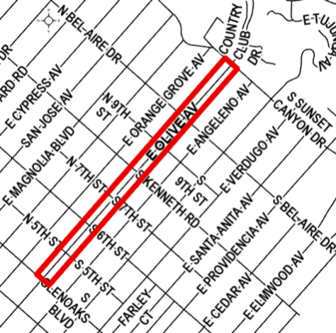 The restriping will narrow vehicle lanes, add a wide painted median / turn lane between Glenoaks Boulevard and Sunset Canyon Drive, and restripe the four-lane portion of Olive to two lanes between Glenoaks and Kenneth Road.