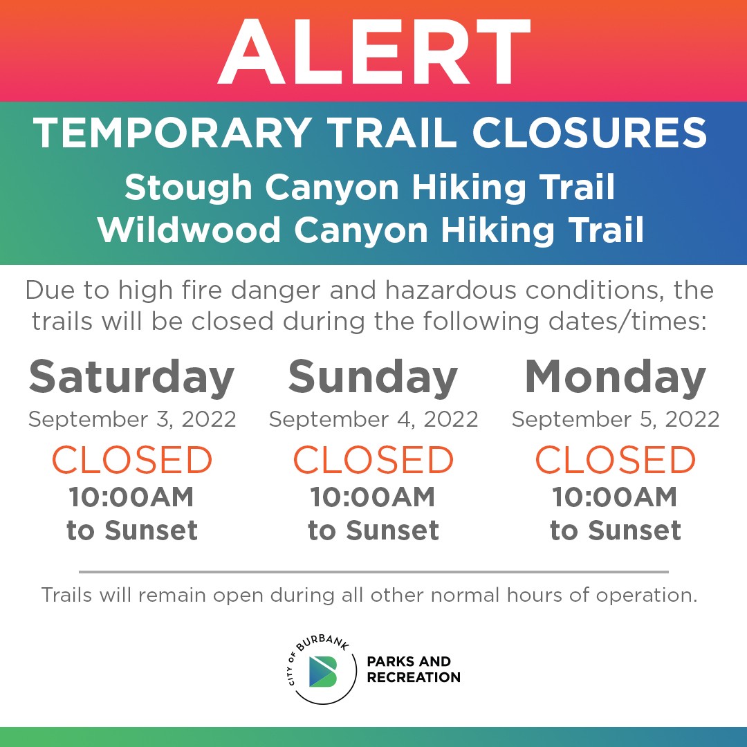 Due to fire danger and hazardous conditions, the Stough Canyon and Wildwood Canyon hiking trails will be closed from 10:00AM to Sunset on Saturday 9/3, Sunday 9/4, and Monday 9/5.