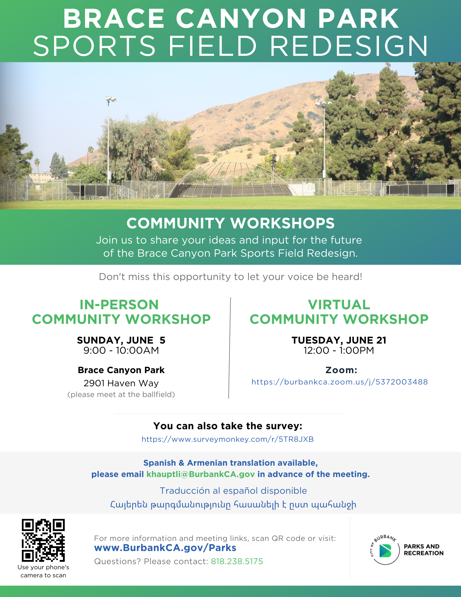 Join us to share your ideas for the future of the Brace Canyon Park Sports Field Redesign. In-Person and Virtual Community Workshops coming up! Can't make it? You may also submit your comments through an online survey.