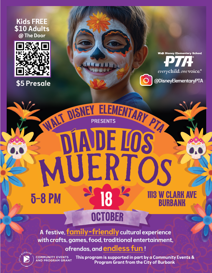 Walt Disney Elementary PTA presents Día de Los Muertos: A festive, family-friendly cultural experience with crafts, games, food, traditional entertainment, ofrendas, and endless fun! This program is supported in part by a Community Events and Program Grant from the City of Burbank.