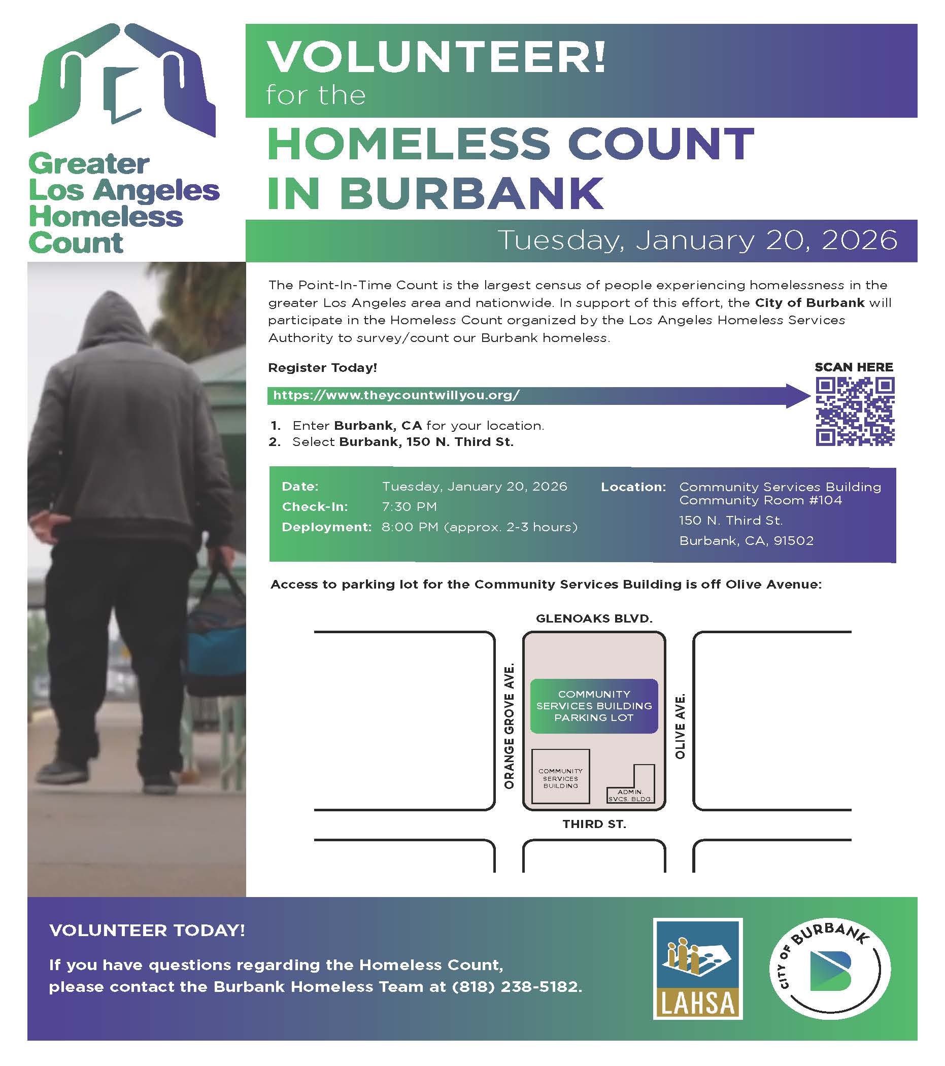 The Community Development Department invites you to volunteer for the 2026 Homeless Count, scheduled for Tuesday, January 20, 2026. The annual Homeless Count is the largest census of people experiencing homelessness in the greater Los Angeles area and nationwide. In partnership with the Los Angeles Homeless Services Authority (LAHSA), the City of Burbank will participate in this critical effort to better understand the needs of our unhoused residents.