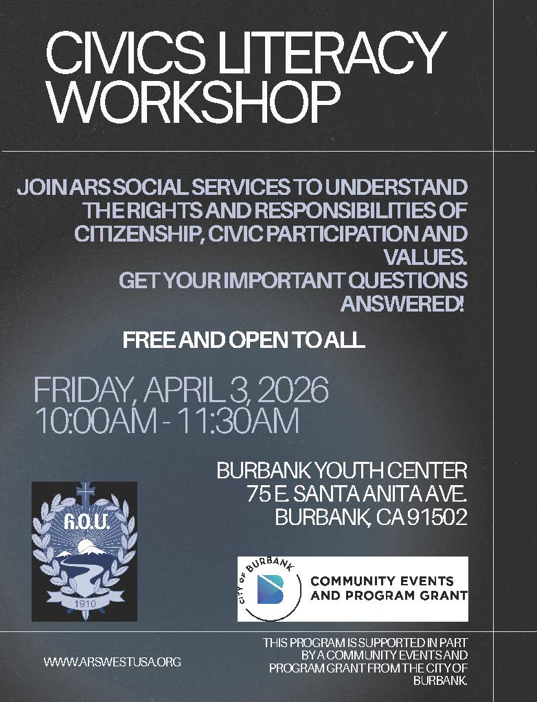 Join the Armenian Relief Society (ARS) - Western USA Social Services to understand the rights and responsibilities of citizenship, civic participation and values. Get your important questions answered! Free and open to all.