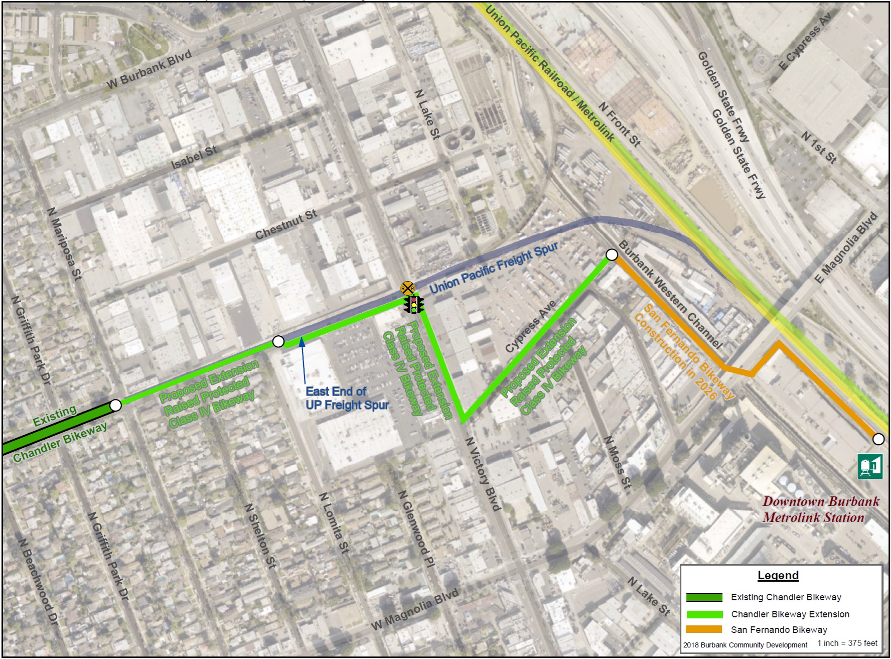 The Chandler Bikeway Extension is a proposed 0.6 mile Class I and Class IV bicycle path that will provide a connection from the existing Class IV Chandler Bikeway to the Downtown Burbank Metrolink Station. The project aims to close an existing gap in Los Angeles County's Regional Bikeway network, and provide multi-modal connectivity to the Downtown Burbank Metrolink Station. This project is funded through a Metro/Caltrans Federal Grant and Measure R Highway Operations Funds. The project budget is $3.3 million.
