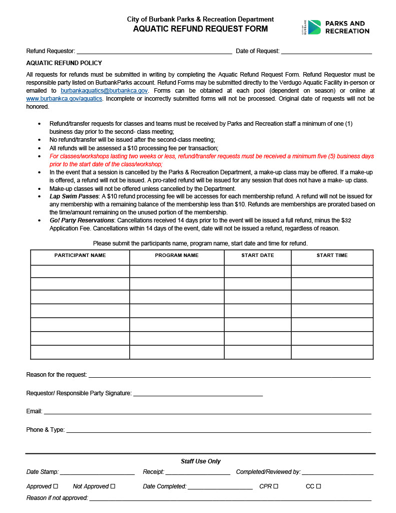 - Refund requests must be received by Parks and Recreation staff a minimum of one business day prior to the second class meeting. No refund will be issued after the second class meeting.