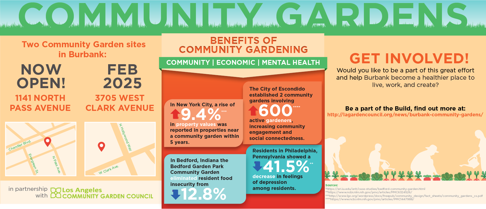 The City of Burbank and the Los Angeles Community Garden Council (LACGC) are partnering in the development of two new Burbank Community Gardens. The community gardens are located at 1141 North Pass Avenue is now open, and the 3705 West Clark Avenue Garden will open in Spring 2024.