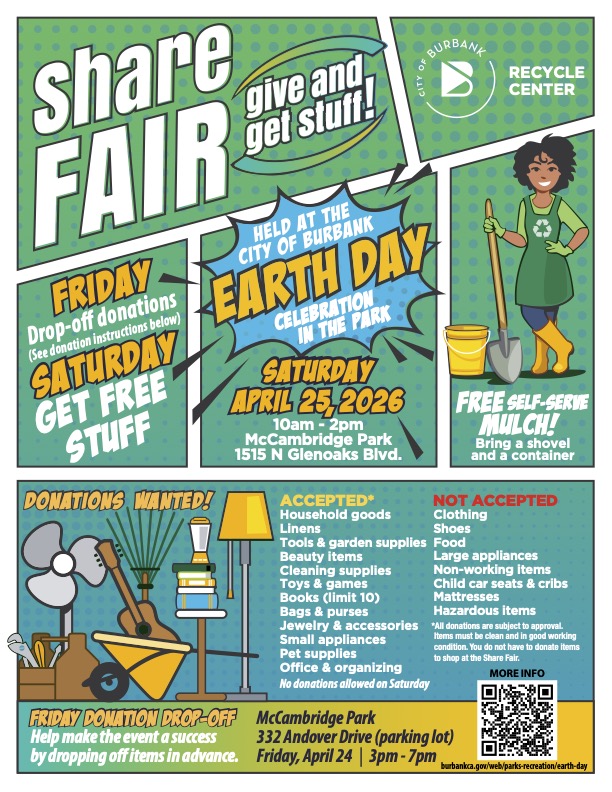 Reduce waste: Give away what you no longer need, take what you'd like. It's all FREE! Donations wanted: Help make the event a success by dropping off items in advance. Donation Drop-Off Event: Friday, April 24th 3:00 PM - 7:00 PM Location: McCambridge Park Parking Lot - 332. Andover Dr. Burbank, CA 91504 NO DONATIONS WILL BE ACCEPTED ON SATURDAY.
