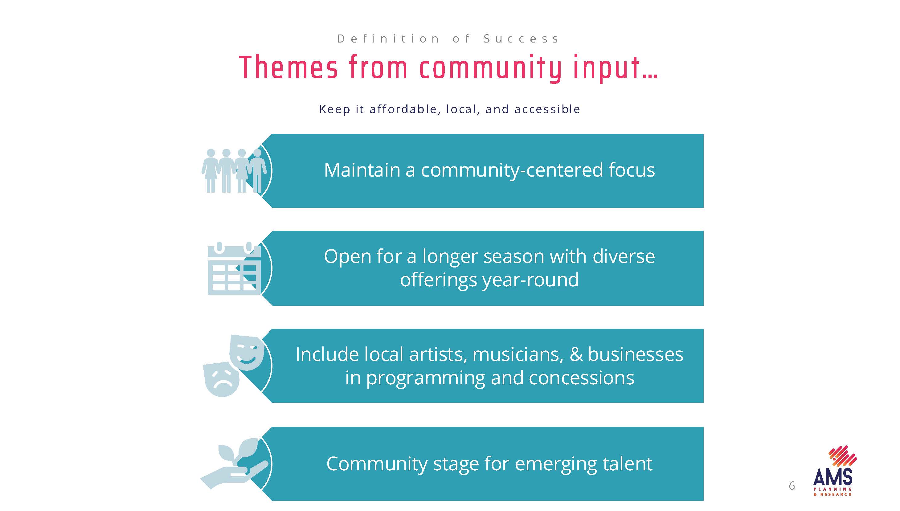 Community input and sentiment informs the recommendations coupled with industry standards for municipal cultural venues and performace spaces.