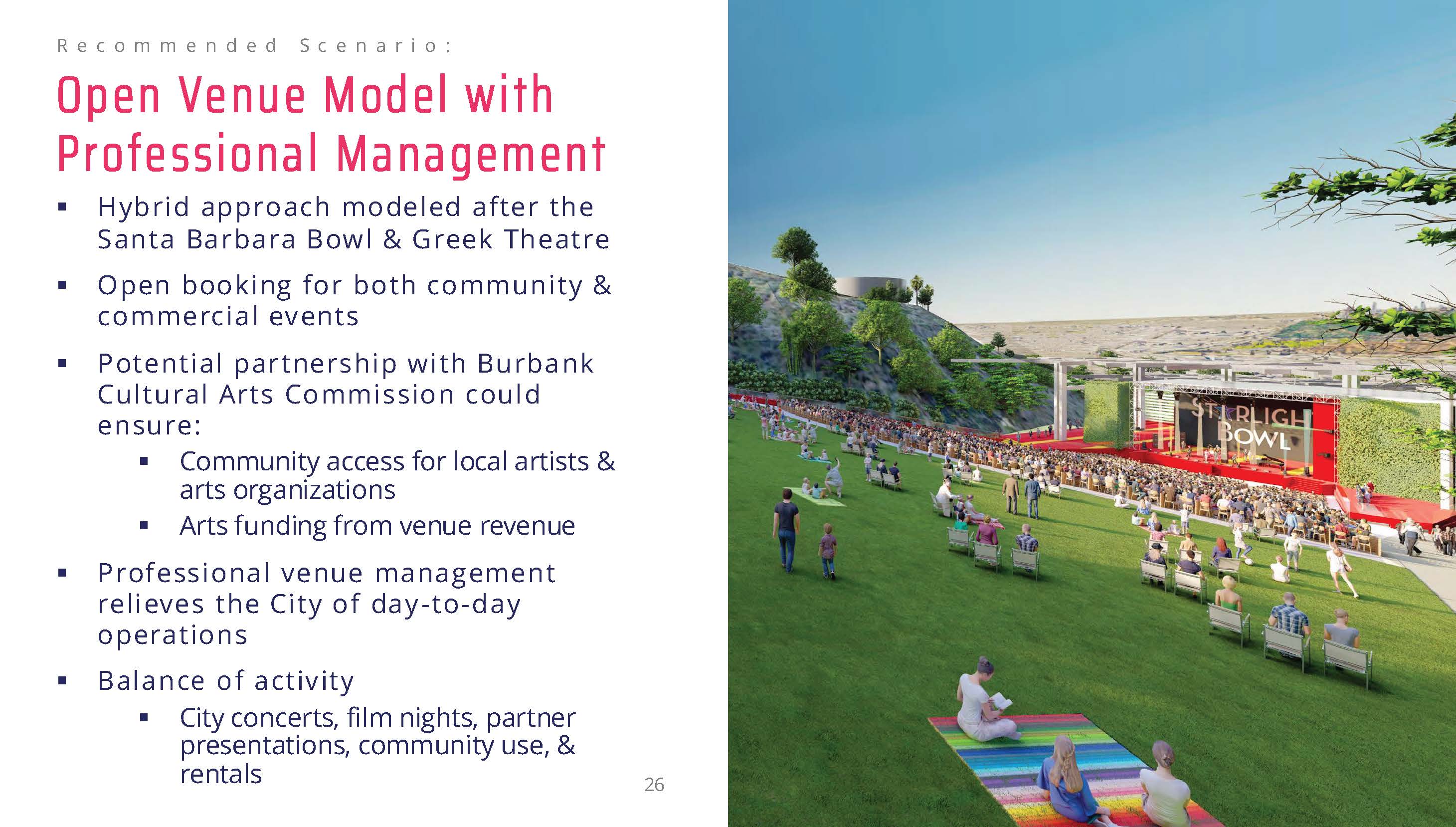 Based on the SoCal market, venue size and constraints, and community needs, their recommendation is an open venue model with professional management. (This proposed model is a recommendation that has not been adopted yet.) The professional venue management relieves the City of day-to-day operations while offering a balance of activity including City concerts, film nights, partner presentations, commercial programming, community use, and rentals. The current concept identifies a variety of events at the Starlight Bowl including seven City presentations (e.g. current offerings), six film screenings & sing-alongs, five commercial co-presentations, six community/nonprofit co-presentations, six commercial rentals, and five community/nonprofit rentals. AMS modeled this work at various levels of capacity, but most were not sell-out audiences for the 35 presentations.